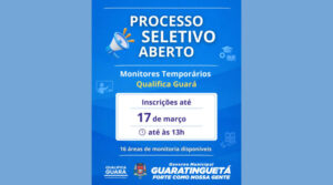 Por Guilherme Costa A Prefeitura de Guaratinguetá iniciou o processo seletivo destinado à contratação de monitores temporários para o programa Qualifica Guará. Os interessados têm até as 13h do dia 17 de março para realizar a inscrição exclusivamente pelo site da GL Consultoria. As oportunidades abrangem 16 áreas de atuação, incluindo: Serviços e Manutenção: Garçom, […]